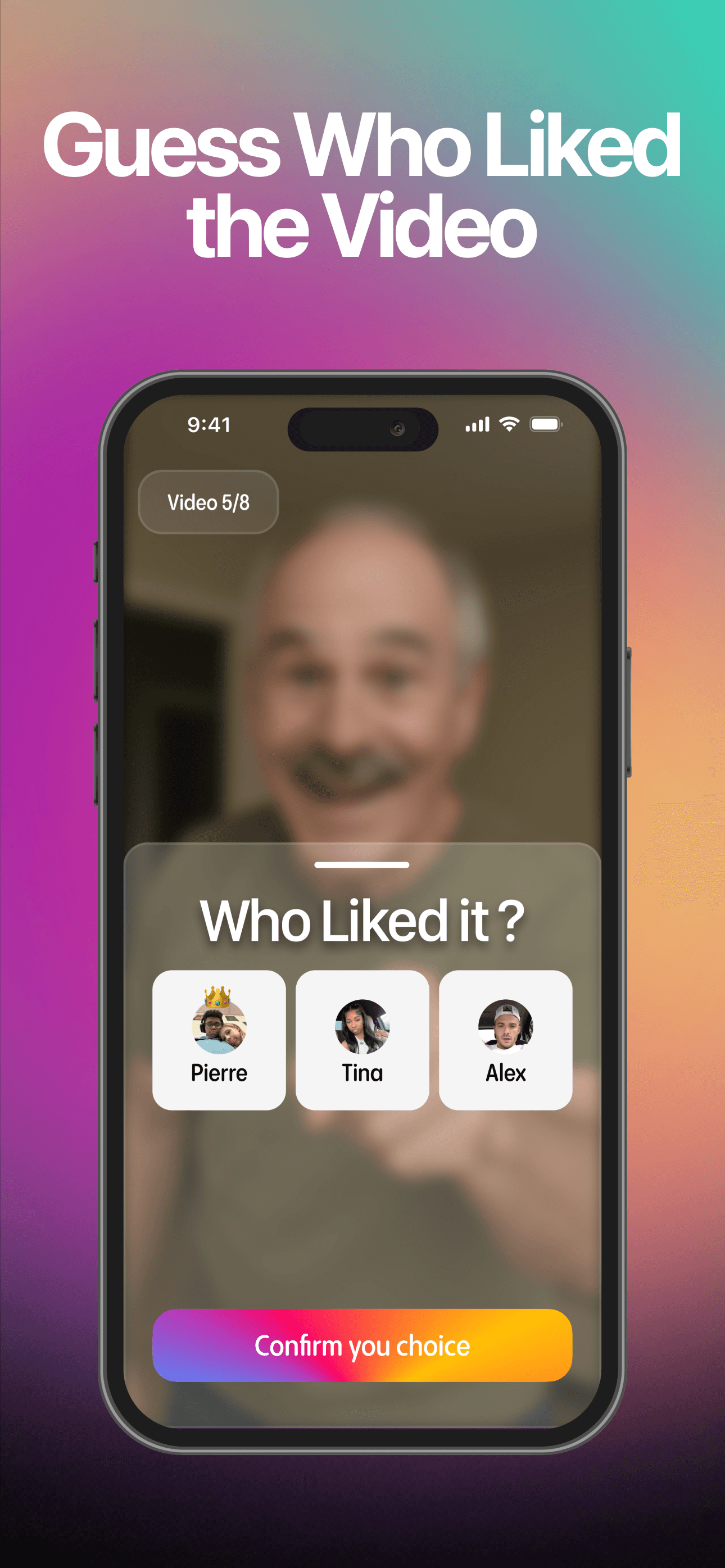 One video shows up every minute, and everyone guesses who in the group liked it.